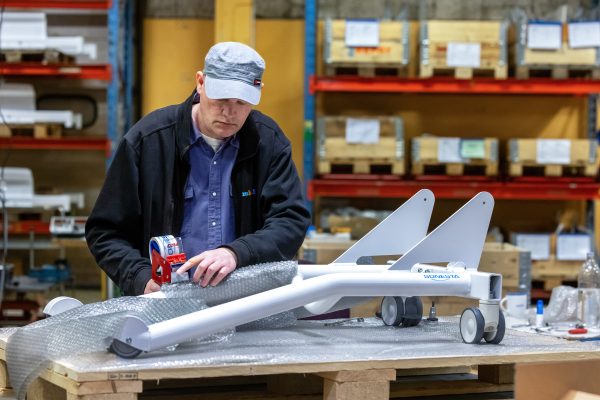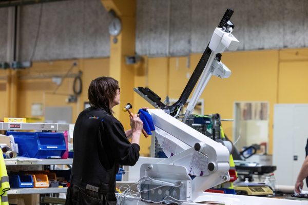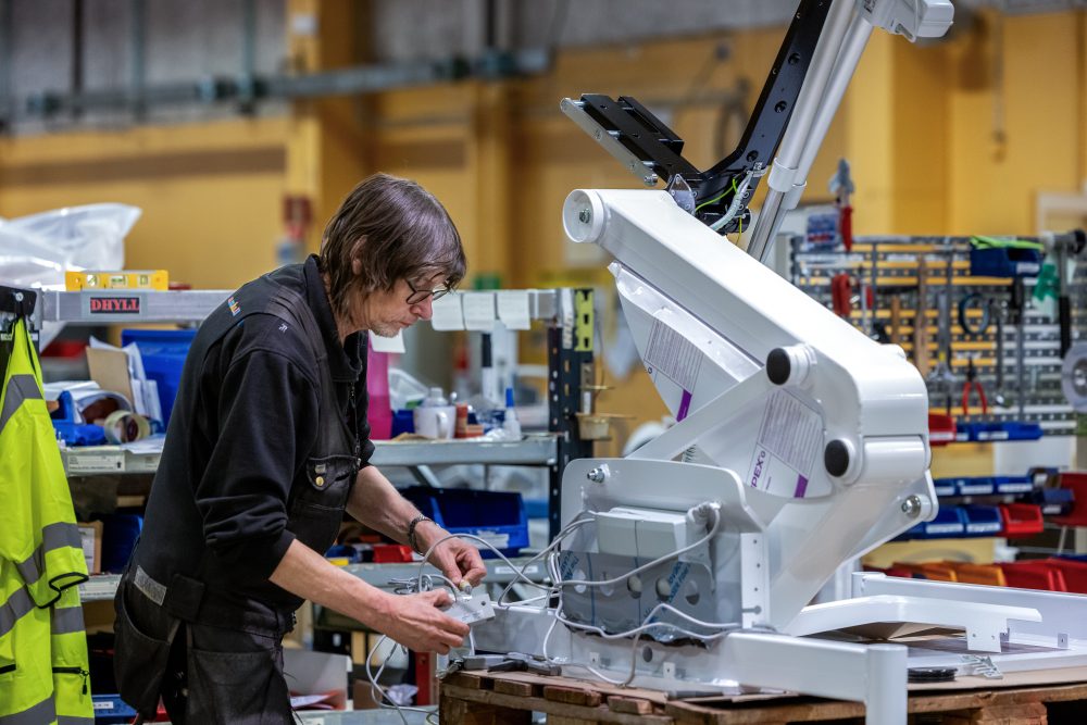 Mikael Eriksson sätter ihop en stol från Sonesta Medicals senaste generation. Samtidigt utarbetar han en monteringsanvisning till sina kollegor.